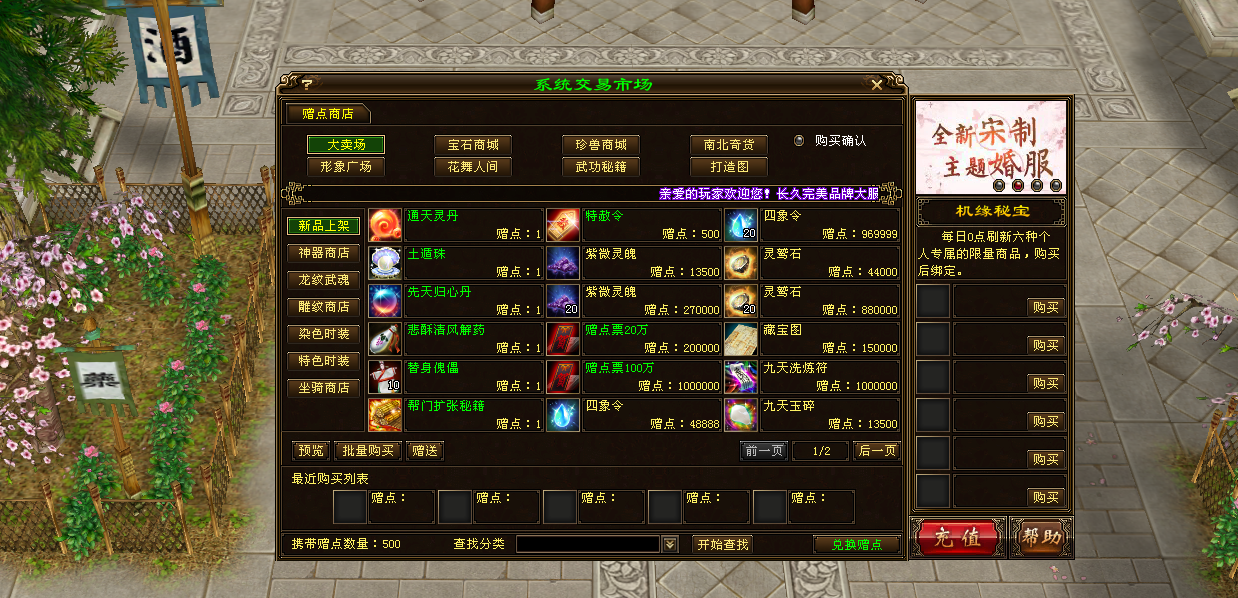 每天晚上8点刷新:500W赠点票 成品假重楼8件中的一件 上古神书残叶 门派技能兑换符 功力丹 玫瑰花 装备至尊强化 主宰之灵 神兽之泪 超级神器材料50元RMB ,