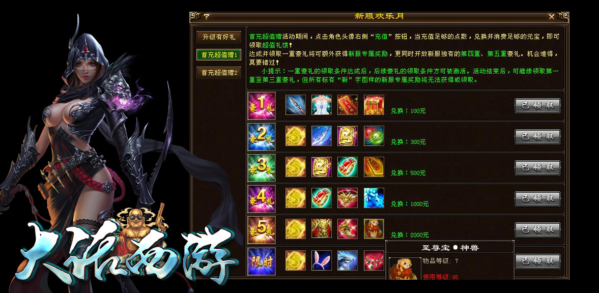 二郎真君:本服超强BOSS,每日在云浮出现一次,身上携带会员神器,属性超强!