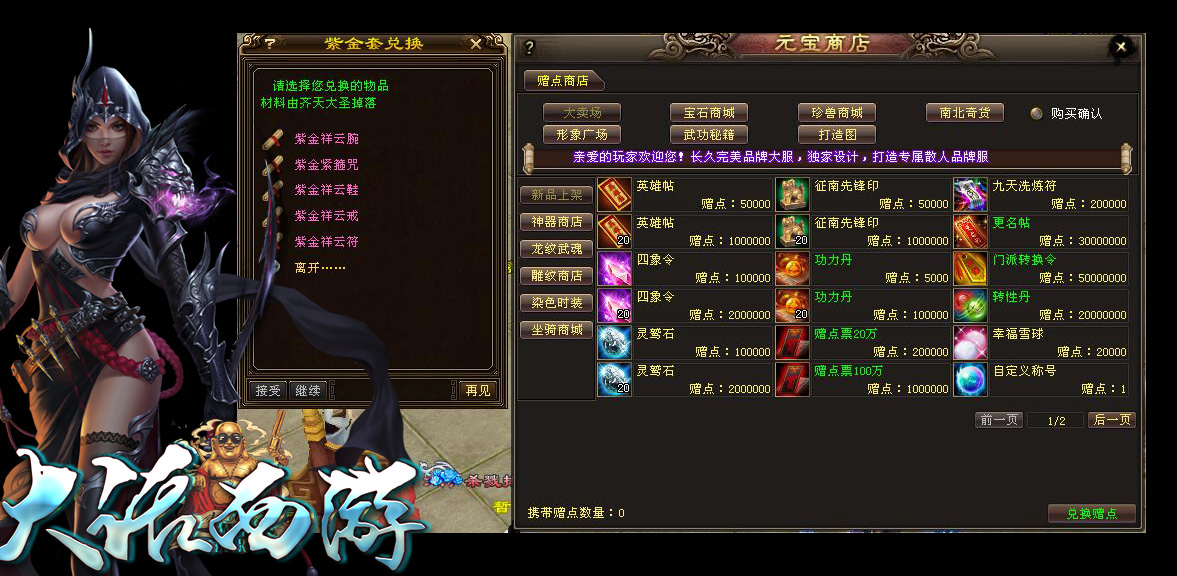 【充值比例】:1元=1点=20万赠点 1W元宝,在线充值。